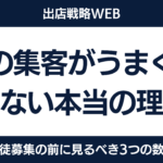 2026年2月5日 / 最終更新日 : 2026年2月6日 銘苅拓也(めかるたくや) 塾・スクール 個人塾の集客がうまくいかない本当の理由|生徒募集の前に見るべき3つの数字 「チラシを撒いても反応がない」「SNSを毎日更新しているのに問い合わせが増えない」 個人塾の経営者からこうした相談をいただく際、多くの方が「キャッチコピーが悪いのか」「デザインが古いのか」と手法の改善に目を向けます。しか […]
